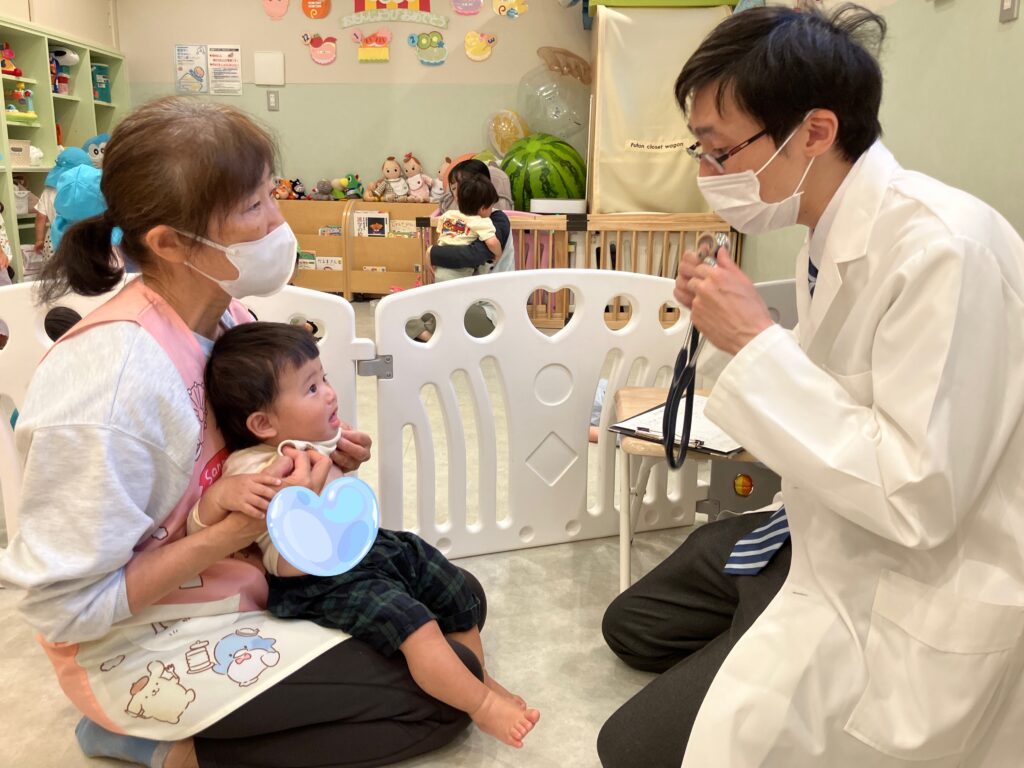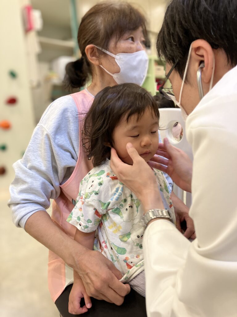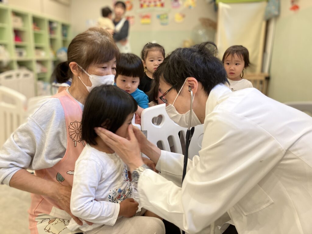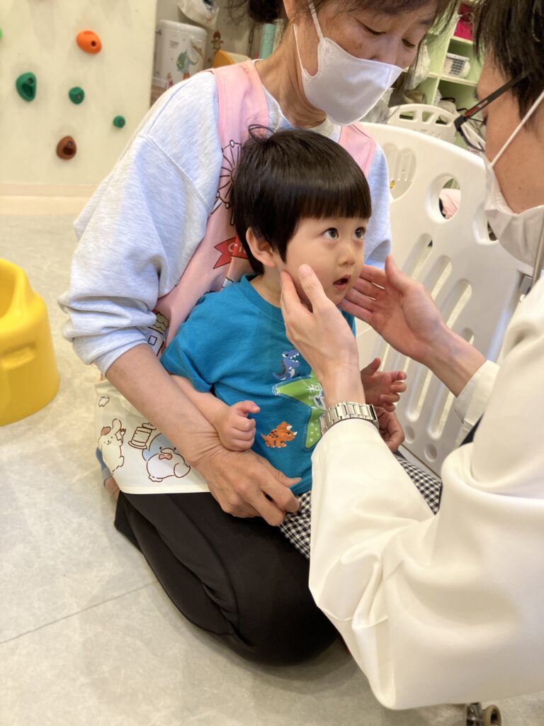 保育者にやさしく抱っこされたり、「大丈夫だよ」「すぐ終わるよ」と声をかけてもらうことで、少しずつ表情がやわらぎ、落ち着いて健診を受けることができました。