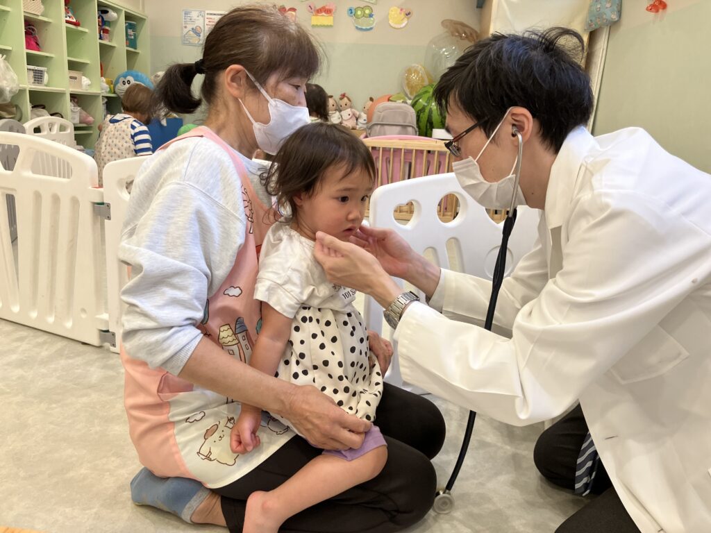 保育者にぎゅっと抱っこされながら、お医者さんにのどや胸の音を診てもらいました。